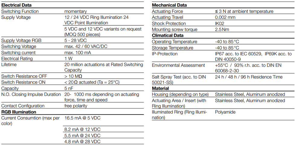 Description ● Available in version Standard, lettered, with Point Illumination or Ring Illumination ● RGB, RGY: flexible input voltage from 5 - 28 VDC at constant brightness ● With color combination RGB and RGY ● 7 possible colors with RGB configuration ● 3 possible colors with RGY configuration ● Pins / Wire / Crimp Terminal male / Cable with Faston