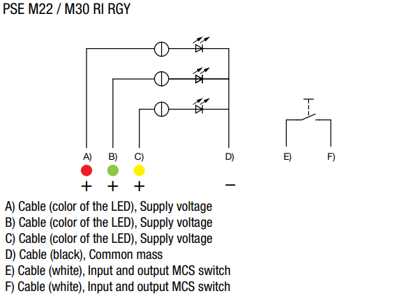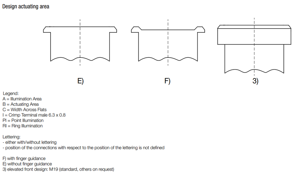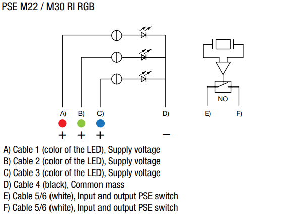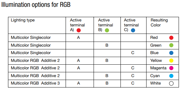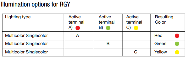 Description ● Available in version Standard, lettered, with Point Illumination or Ring Illumination ● RGB, RGY: flexible input voltage from 5 - 28 VDC at constant brightness ● With color combination RGB and RGY ● 7 possible colors with RGB configuration ● 3 possible colors with RGY configuration ● Pins / Wire / Crimp Terminal male / Cable with Faston
